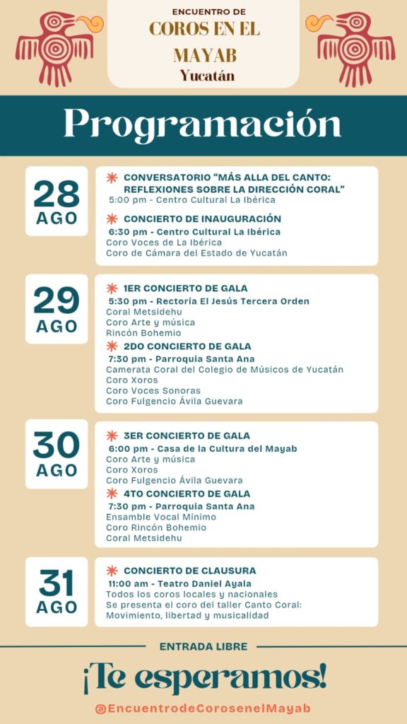 Del 28 al 31 de agosto, Mérida será sede de la segunda edición del Encuentro de Coros en el Mayab, con conciertos gratuitos, talleres y actividades para todo el público. ¡Voces de todo México se unen para brindar una experiencia única!